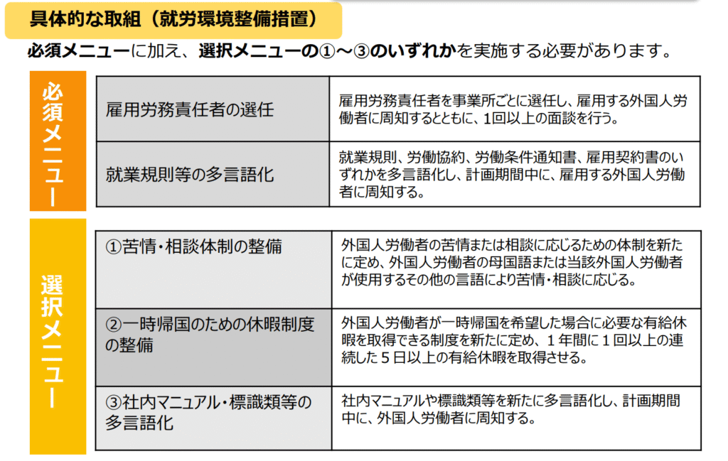必須メニューである「雇用労務責任者の専任」「就業規則等の多言語化」に加え、選択メニューのうちいずれかの実施が必要です。
