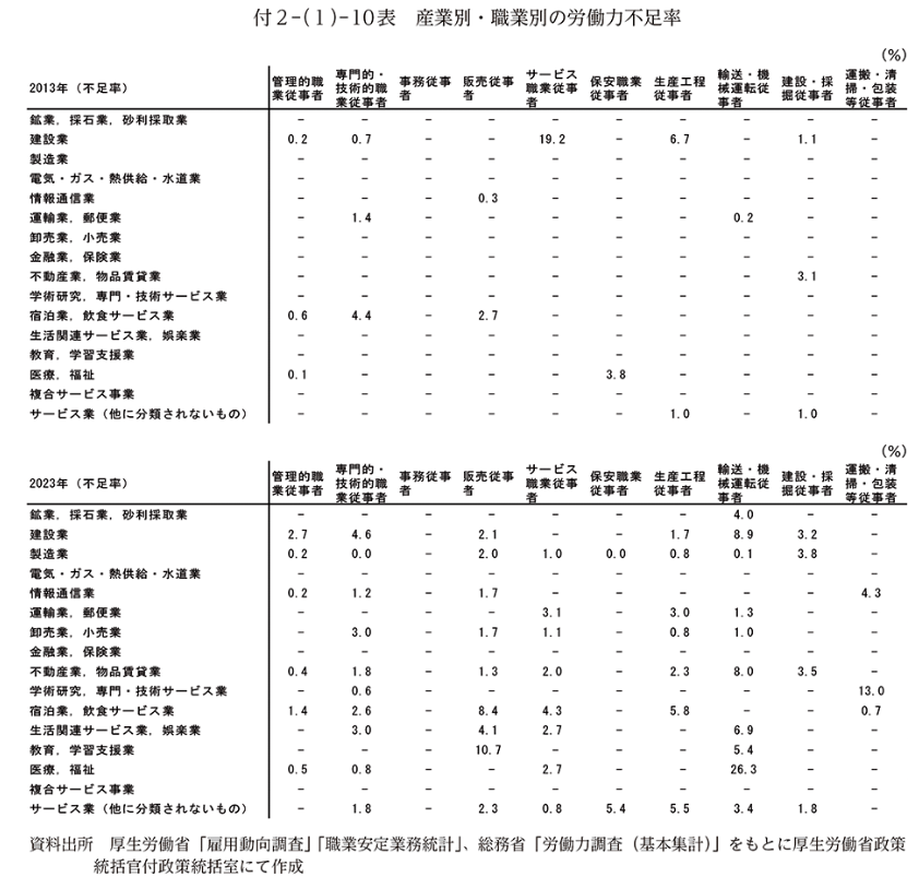 (出典:厚生労働省、付2-(1)-10表 産業別・職業別の労働力不足率